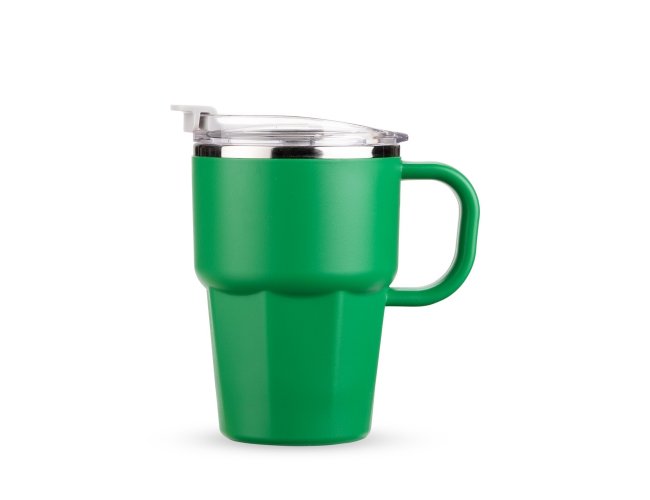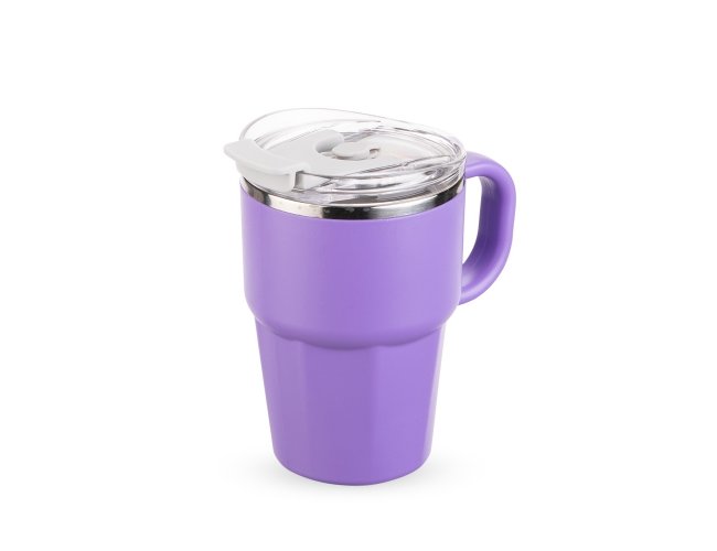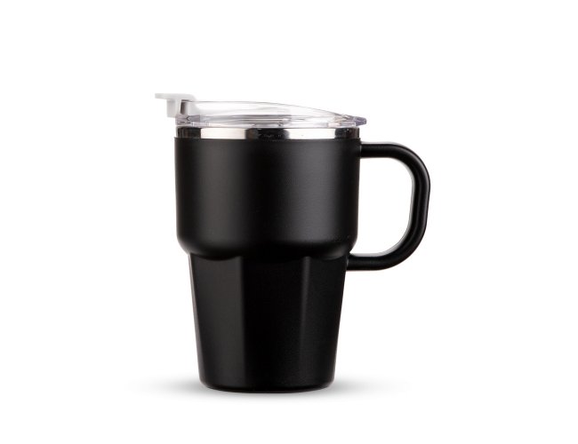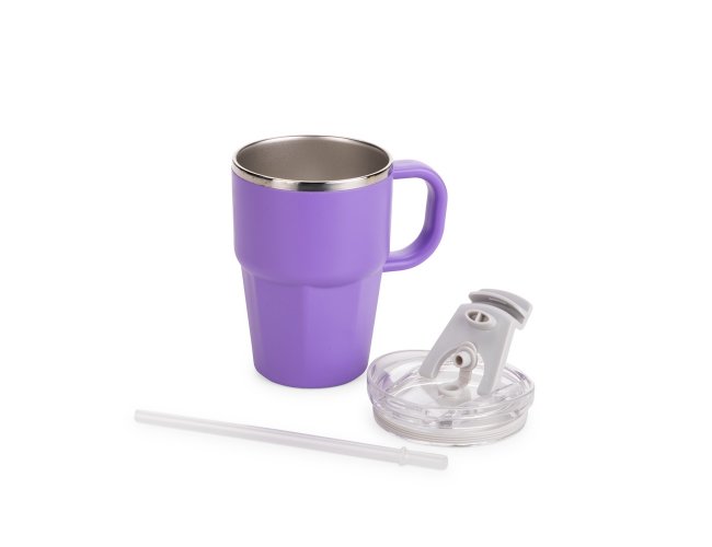 Caneca de parede dupla com interior em inox 304, revestimento externo e alça em plástico polipropileno (PP) e capacidade máxima de 550ml. Possui tampa de pressão em AS com protetor para o bocal em PP, além de acesso para canudo e anel de vedação em silicone, permitindo duas formas de consumo de bebidas. Acompanha canudo plástico.