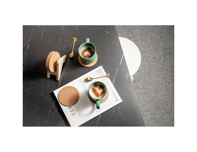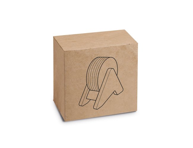 Porta copos em madeira com 6 bases para copos em cortiça. Desfrute da sua bebida evitando marcas na mesa. Certificação EU Food Grade. A cor e o resultado da impressão nos materiais naturais pode variar entre produtos. 140 x 92 x 78 mm